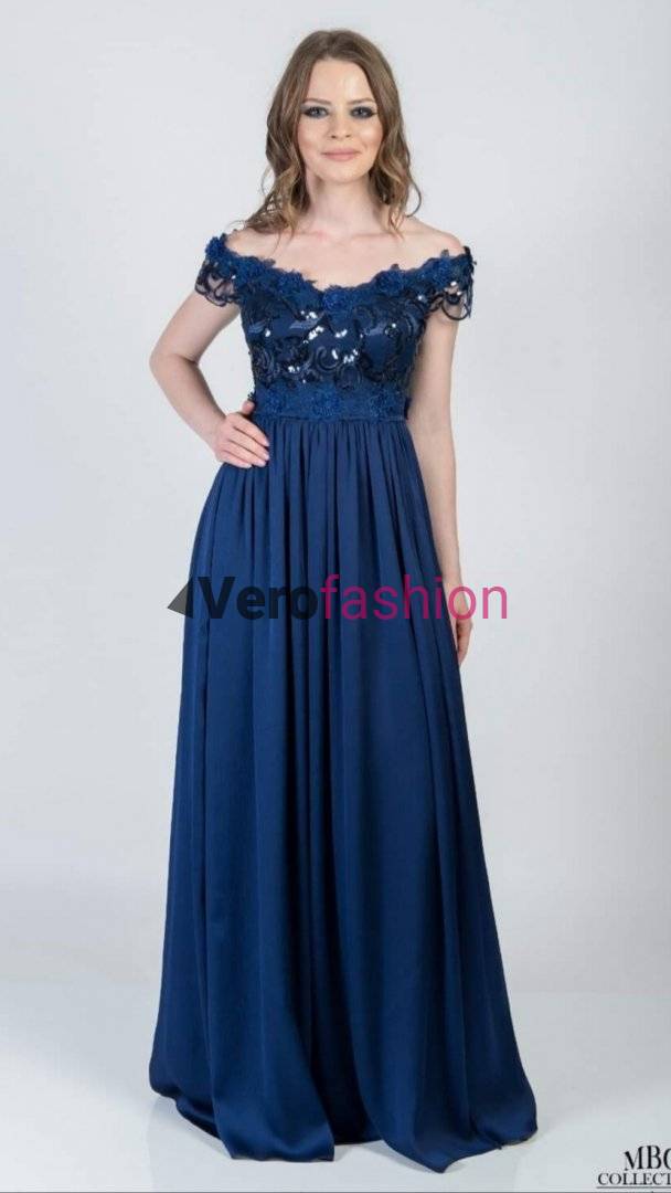 Rochie de seara bleumarin din dantela si triplu voal creponat sidefat
